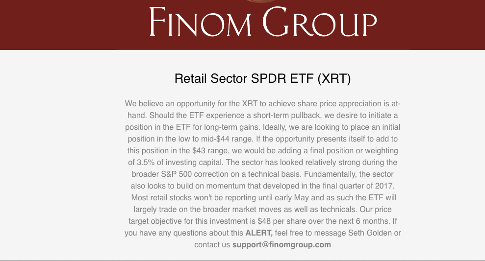 Finom Group has believed there would be a more appreciable environment for the retail sector after last year’s exaggerated sector slow down. It had been the main driving force behind our recommendation earlier this year to invest in the Retail Sector Spiders ETF (XRT) as noted below in our e-mail alert to subscribers.