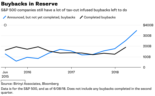 The activity of the central banks to remove liquidity from the financial system has been a longstanding cause for concern. The belief being that central banks boosting liquidity through monetary policies over the last 7-9 years has boosted asset prices, now fosters the belief that removing of such liquidity would reduce asset values. But stimulus by any other name or entity is still stimulus nonetheless. Where the FOMC is draining liquidity/stimulus, the tax cuts and deregulation provide stimulus. It’s the proverbial “fly in the ointment” of bear market participants and even economists who narrowly focus on the central bank influence, blocking out potential offsets. Such stimulus now provided by the U.S. government is serving to not only strengthen the economy, but elongate the economic expansion, serving to further boost asset prices. If we consider more specifically equity prices which follow the path of corporate earnings, we also have to factor in the record level share repurchase programs as boosting earnings and thus boosting asset prices.