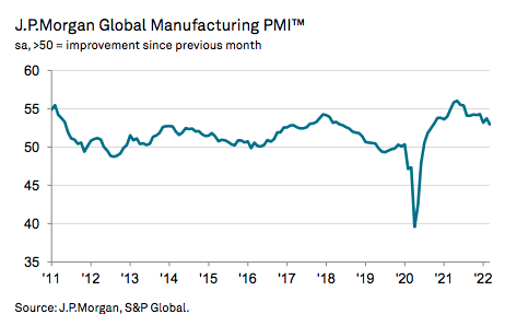 “March saw the rate of expansion in global manufacturing production slip to its lowest during the current 21-month sequence of increase. Output and demand growth were hampered by multiple headwinds, including ongoing COVID disruptions, stretched global supply chains, rising inflationary pressures and elevated geopolitical tensions. The J.P.Morgan Global Manufacturing PMI™ – a composite index produced by J.P.Morgan and S&P Global in association with ISM and IFPSM – fell to an 18-month low of 53.0 in March, down from 53.7 in February. Although signaling an improvement in operating performance for the twenty-first consecutive month, the rate of growth was the weakest since September 2020.”