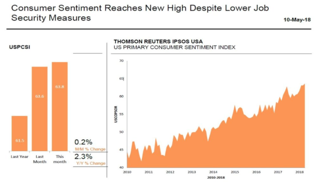 Now let’s take a look at what drives the U.S. economy, consumer spending and sentiment. Here is the most recent consumer sentiment index reading by Thomson Reuters. As one can see from the chart below, consumer sentiment reached a new high.
