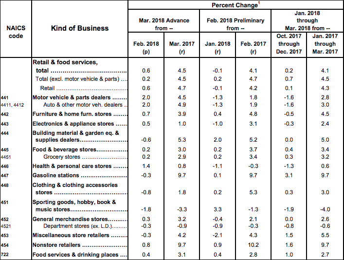 Unfortunately, it wasn’t all good news in the monthly report for March, as department store retailers lost ground to Nonstore retailers, falling both MoM and year-over-year. So what are economists expecting from the Census Bureau when it reports April retail sales? According to economists polled by FactSet, April retail sales are expected to grow .6% once again. There had been little weather impacting retail sales during the month of April although an early Easter may have some seasonal affect on the data. Having said that, tax refunds are now fully impacting the data with consumer sentiment coming in strong.