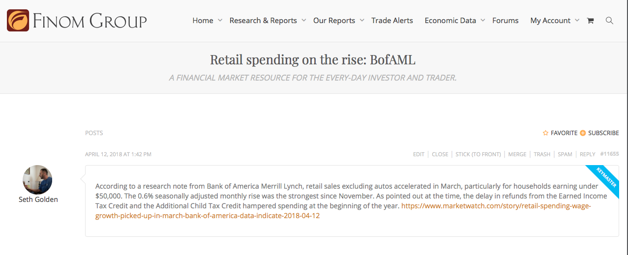 The data showed that retail spending as well as wages accelerated in March. According to the research notes from Bank of America Merrill Lynch, retail sales excluding autos accelerated in March, particularly for households earning under $50,000. The 0.6% seasonally adjusted monthly rise was the strongest since November. Pretty strong data, no, and in light of the actual reported monthly retail sales for March?