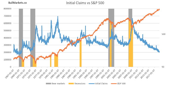 First-time jobless claims fell by 5,000 from a week ago, as the Labor Department reported just 210,000 Americans applying for initial jobless benefits in the week ending Oct. 13, in line with economist estimates, according to a poll by MarketWatch, and close to 49-year lows. Historically, as initial jobless claims go, so does the economy and the stock market follows, as shown in the following chart.