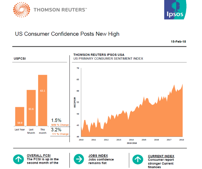 “American consumer confidence as measured by the Thomson Reuters/Ipsos Primary Consumer Sentiment goes into February 2018 continuing its forward progress to stand at 63.1. This is up a point and a half from last month and marks a new post-recession high. Jharonne Martis, Director of Consumer Research at Thomson Reuters, said, “Consumer confidence has a big impact on spending. The recent improvement is also reflected in The Thomson Reuters Retail and Restaurant earnings index, which has experienced a significant upward revision. The index is expected to grow 7.6% for the current quarter, up from 5.4% last month.”