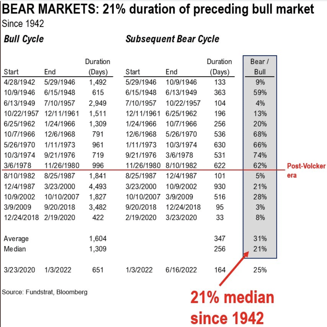 Fundstrat: “Historic average ratio of bear to bull cycle time is 31%, indicating a bear market ~ 1/3 of the bulls duration. 2022 bull market completed 651 days, bear market would be 164 days thru June 6 or -25%, which is within the range of the average and median bear markets, historically. It’s possible, like in 1982, the entirety of the bear market is erased over the next 4 months.”