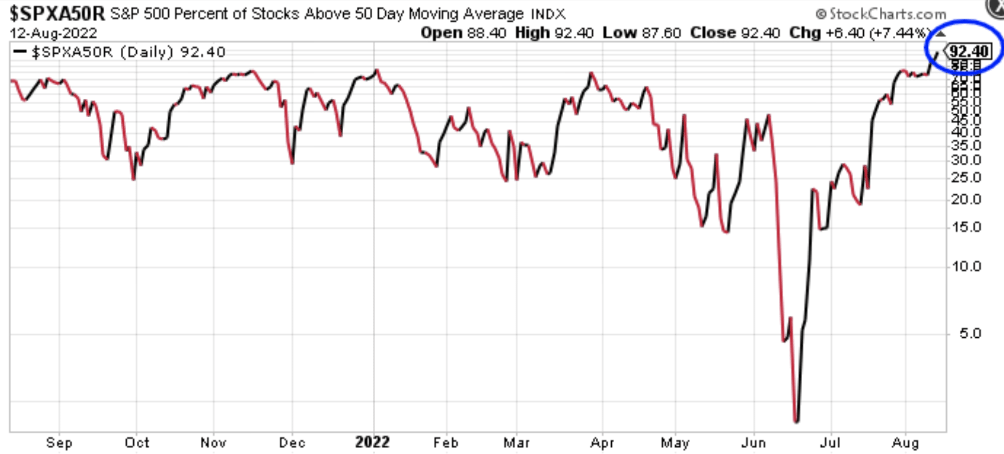 At the end of the week, more than 92% of S&P 500 stocks finished above their 50-DMA. It’s important to let this sink in for a minute and reflect on what it actually means. It’s one thing if a handful of large-cap stocks are driving the market higher, it’s a whole other story when the vast majority (92%+) of stocks are participating in the market rally. More than 92% of stocks are indeed trading ABOVE their interim moving average (50-DMA). So what does history tell us about “when more than 90% of stocks are trading above their 50-DMA in the S&P 500?”