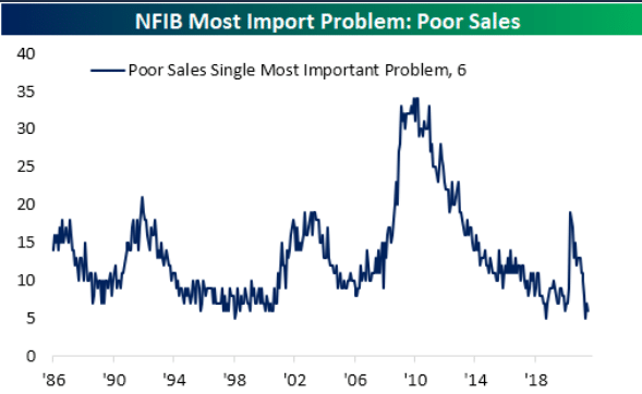 This is one of my favorite indicators and should help investors and economists discern between the noise in the NFIB index and the actual outcomes. There are rarely ideal or perfect small business conditions, but you know the economy is humming when hardly any businesses are citing “poor sales” as their #1 problem.