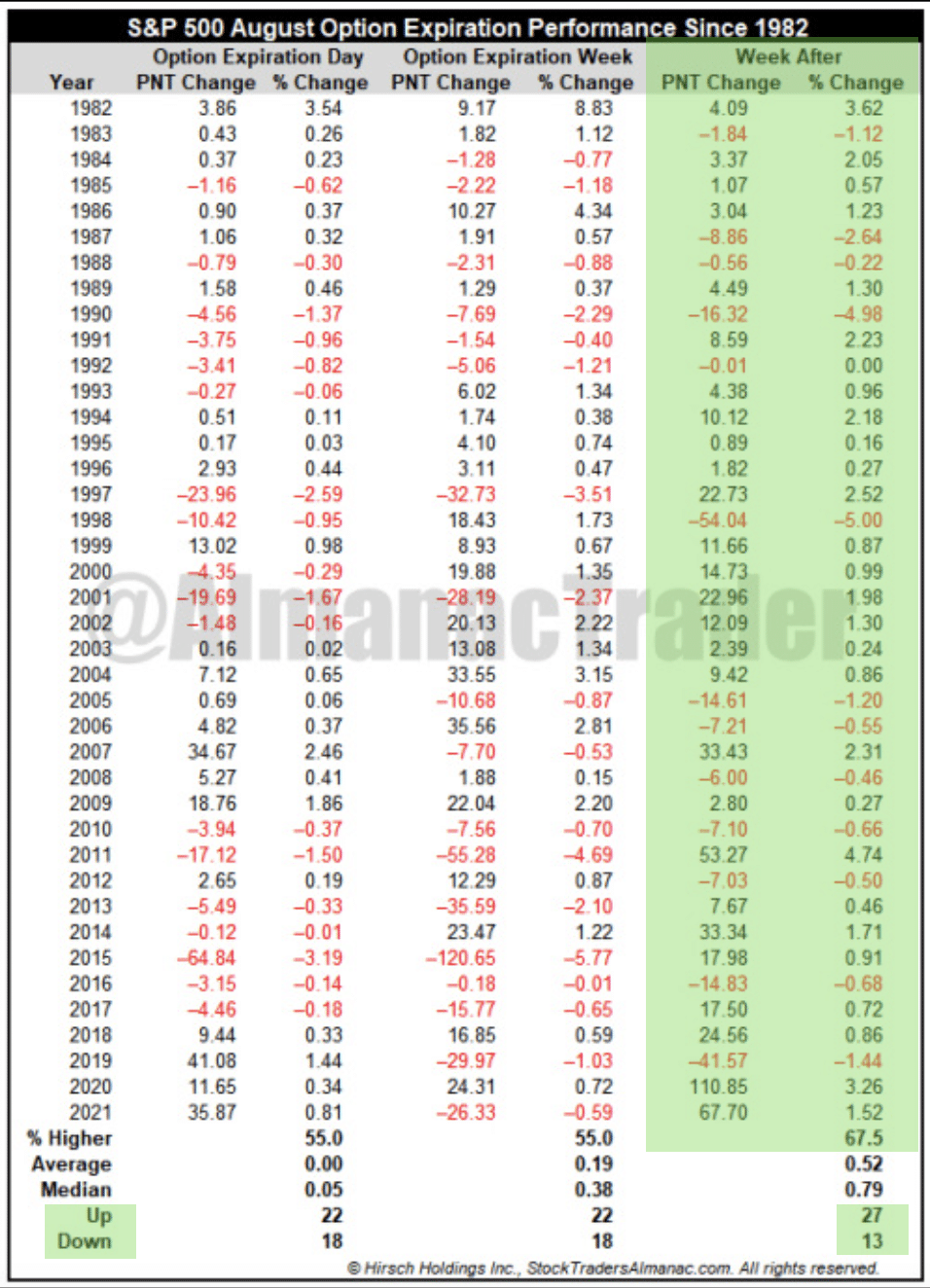 As shown in the table above from The Almanac Trader, the S&P 500 has been only slightly higher and only a slight majority of the time during monthly Op/EX week. Based on this observation, even that slight positivity rate didn’t work well for this past August Op/EX period. Having said that, the week after monthly Op/EX (this coming week) has delivered above average weekly returns and higher 67% of the time; 27 times up and 13 times down, with a +.52% average weekly return.