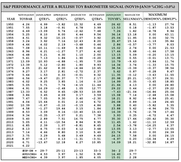 Indeed, the bullish signal was fired for 2021. The only thing left to discover is how the forward quarterly and annual return will unfold for investors. The statistical data for the TOY Barometer is displayed in the most updated table below from Wayne Whaley himself: