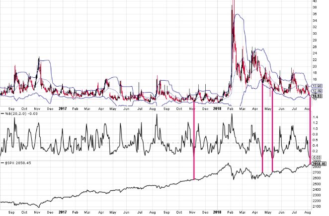 The longstanding rally in the S&P 500 since the February correction will likely find the index achieving record highs near term and barring any significant geopolitical developments of consequence. Alongside the S&P 500 rally we’ve seen volatility reined in significantly since the VIX topped 50 back in February. In technical terms and analysis, the VIX has been crushed lately and is now below its 2 standard deviation Bollinger Band as shown in the chart below.