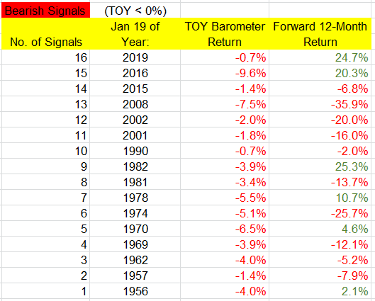 There have been 19 neutral signals. The following year was positive 12 times (63%), compared to 77% win rate for “all years.” The overall average and median returns were 6.0% and 7.1 percent. But among the “up” years, the average and median gains were 14.4% and 9.4%, while the “down” years’ average and median losses were -8.5% and -7.8 percent. There were several big up years (1995, 1996, 1998, 2003), and two big down years (1973, 1977), so even if there is a neutral signal, there’s still a decent chance the following 12 months will venture far from its January 19 print.