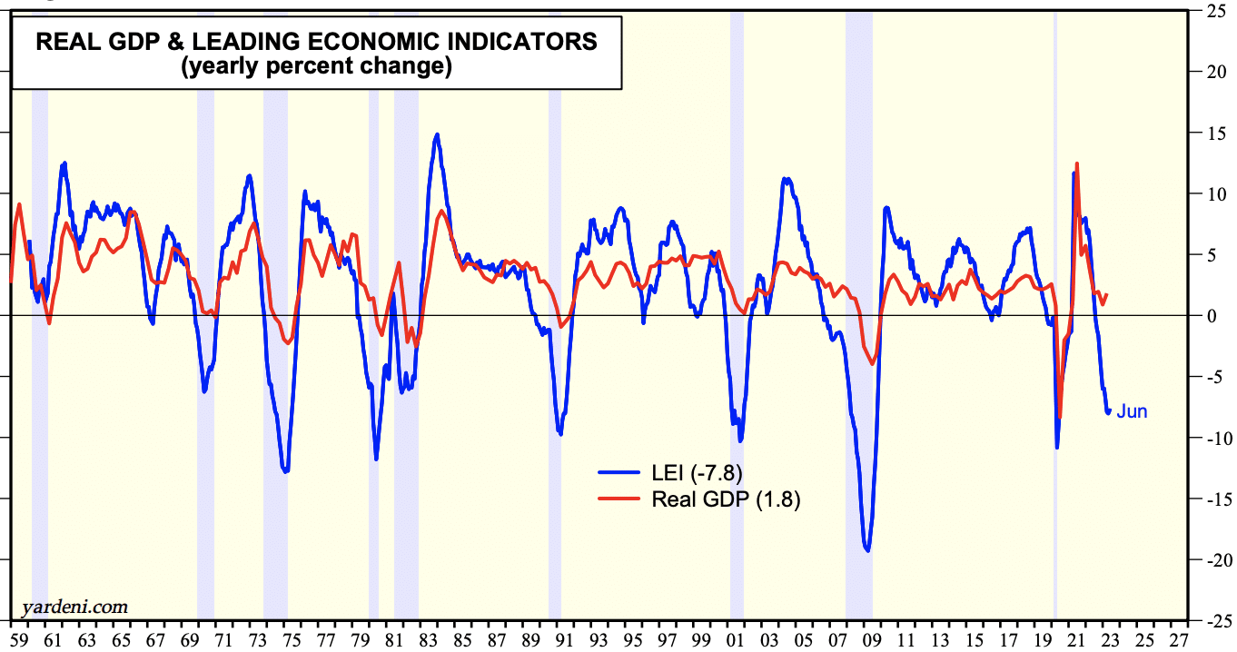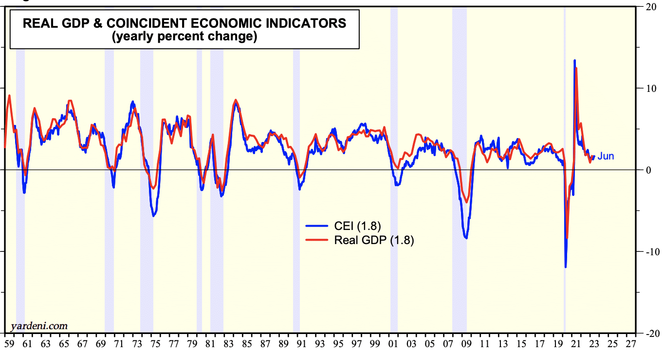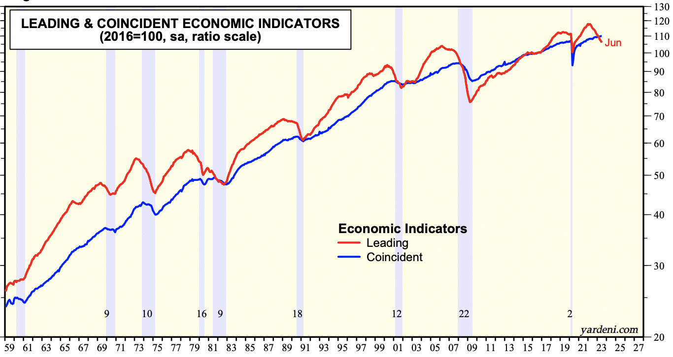 The following chart of the LEI and CEI evidences why a recession has not been labeled since the Covid recovery began: (charts from Yardeni Research)