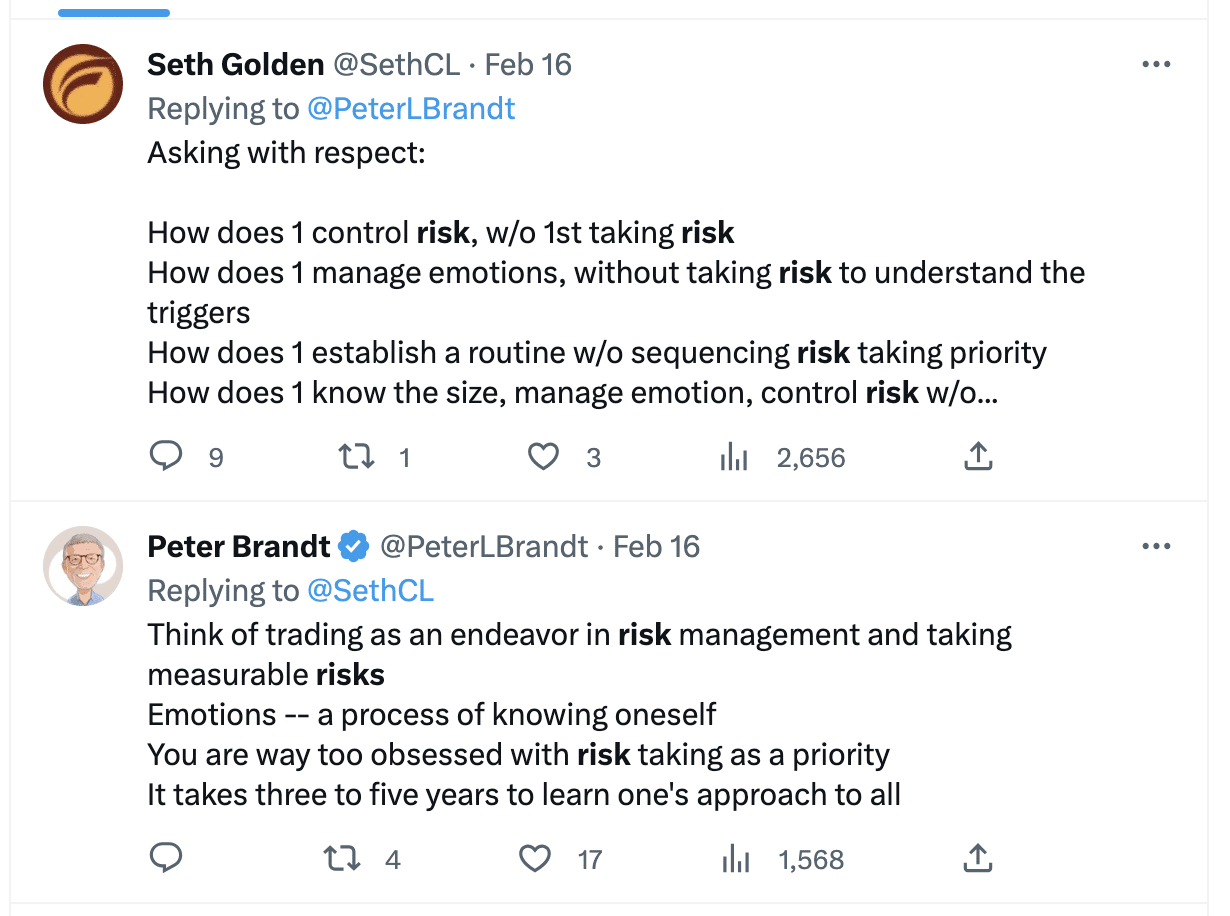 The above tweet engagement is a good back and forth on what risk is, and the practical recognition of risk for investing purposes. It all starts with the willingness to take and feel risk. Without being able to do so, nothing can be stimulated or assessed.