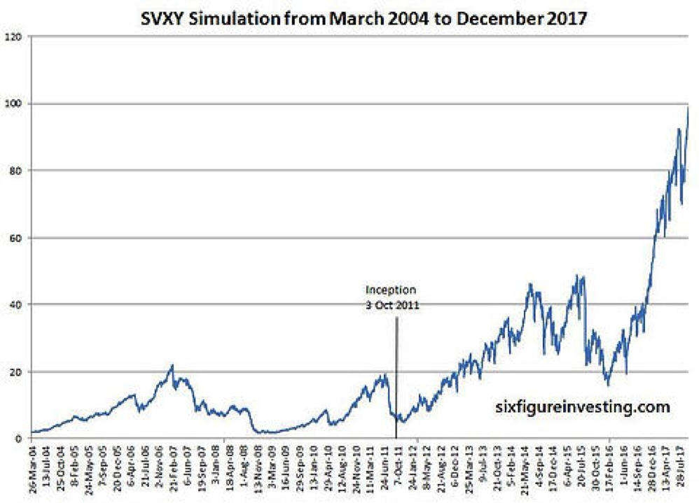 - Most of the time (75% to 80%) SVXY can be a moneymaker and the rest of the time it can give up much of its value in a few weeks—drawdowns of +90% are not unheard of. The chart below shows SVXY from 2004 using actual values from October 2011 forward and simulated values before that.