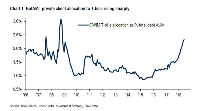According to BofA Merrill Lynch Global Research, U.S. equity funds saw outflows of $29.7 billion in the latest week, the second-largest one-week redemption in history. They pulled $24.2 billion from U.S.-focused stock funds, the third-largest weekly outflows in history. At the same time, private-client allocations to Treasuries have surged to a 10-year high in 2018.