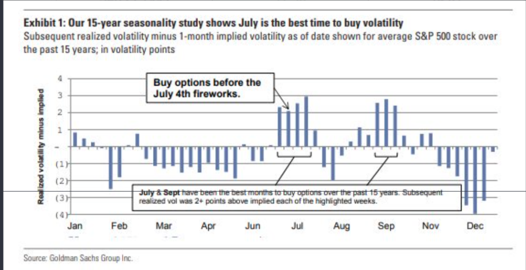 In terms of market volatility, July tends to be the best time to buy volatility from a seasonal standpoint. The chart below from Goldman Sachs validates such seasonality trends over the last 15 years.