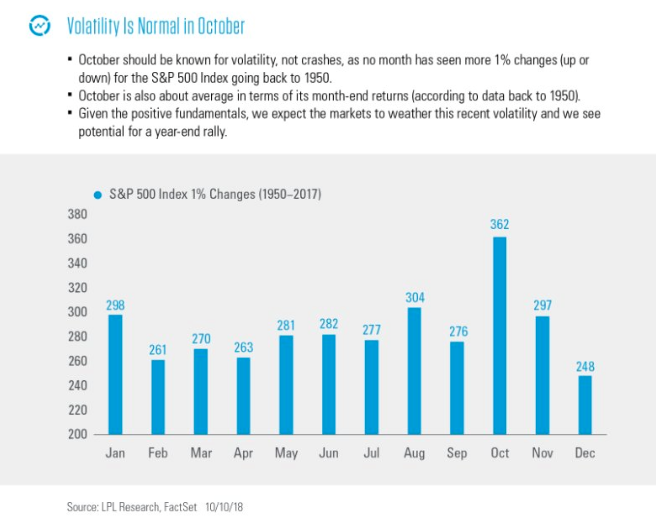 Prior to and through the market tumbling, volatility has been on the rise. After the least volatile Q3 for stocks since 1963, it is important to remember that October is typically the most volatile month of the year for the S&P 500.