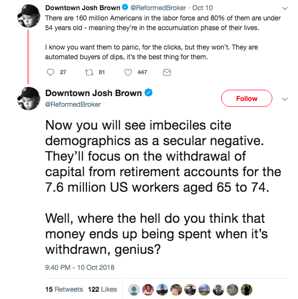 “Americans have accumulated $28.3 trillion in retirement assets, 19% of which is in 401(k) accounts ($5.3 trillion). There are 550,000 plans and 54 million participants. These dollars are coming in every month, the lower the prices for stocks, the better,” said Brown in a wee-hours tweet-rant, as he adds: “F****ing bring it.”
