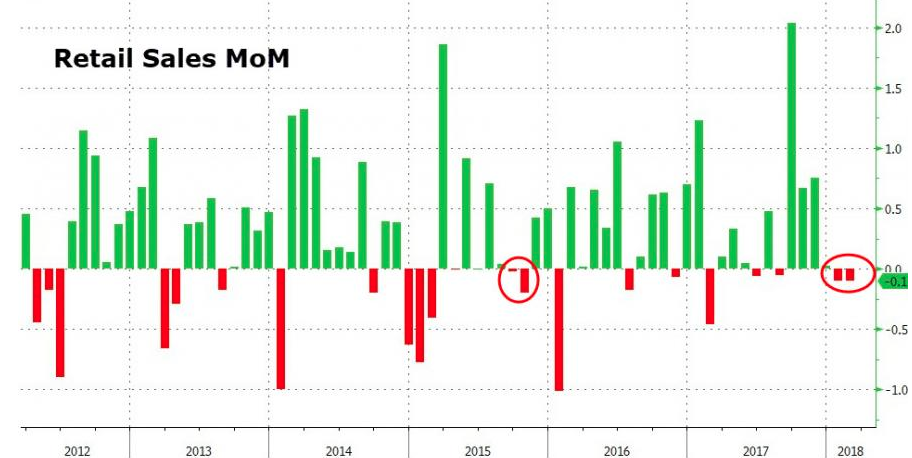 The Commerce Department reported that retail sales slipped 0.1% last month with economists forecasting growth of .4% for the month. January data was revised to show retail sales declining 0.1% instead of falling 0.3%, as previously reported. It was the first time since April 2012 that retail sales have declined for three straight months, signaling a potential slowdown from the U.S. consumer. On the bright side, however, total retail sales grew by 4% in the month of February on a YOY basis. Below is a breakdown of February retail sales by category on a MoM and YOY basis: