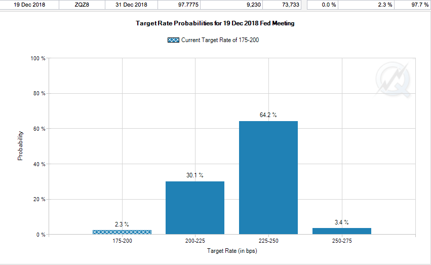 In a widely expected move, the central bank’s policymaking FOMC voted unanimously to keep the target range for its benchmark rate at 1.75% to 2 percent. The committee is widely expected to approve an increase at the September meeting. The statement said the labor market has “continued to strengthen,” language consistent with the June and “economic activity has been rising at a strong rate,” a more bullish view than the June characterization of “solid” growth. The committee also noted that its policy stance remains “accommodative” and said inflation continues to progress near the Fed’s 2% goal. For the balance of the 2018, the Fed is expected to raise rates by a .25 bps in September and December. A December rate hike is highly debated given the geopolitical concerns and what seems to be a decoupling of U.S. economic growth from that of global economic growth due, in part, to increased trade war escalations. At present, the CME’s FedWatch Tool gives a December rate hike a 64% probability as depicted in the graphic below.