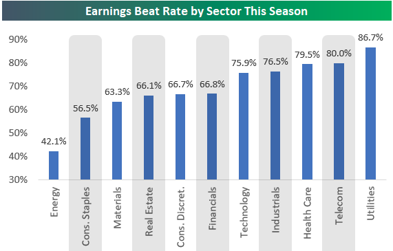 The beat rate for quarterly reports remains strong quarter-over-quarter. Tech stocks are beating at a very high rate of 75.9%, but even with such strength some of these results are finding stocks being sold-off due to perceived stretched valuations. Below is a chart that identifies the beat rate by sector, as developed by Bespoke Investment Group.