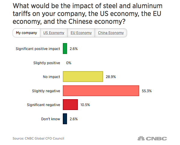 A recent survey was conducted by The CNBC Global CFO Council, which represents some of the largest public and private companies in the world, collectively managing more than $4.5 trillion in market capitalization. The survey was conducted after President Donald Trump signed a pair of proclamations that impose tariffs on imported steel and aluminum, but before the announcement of tariffs aimed at China. The results from the survey are noted below: