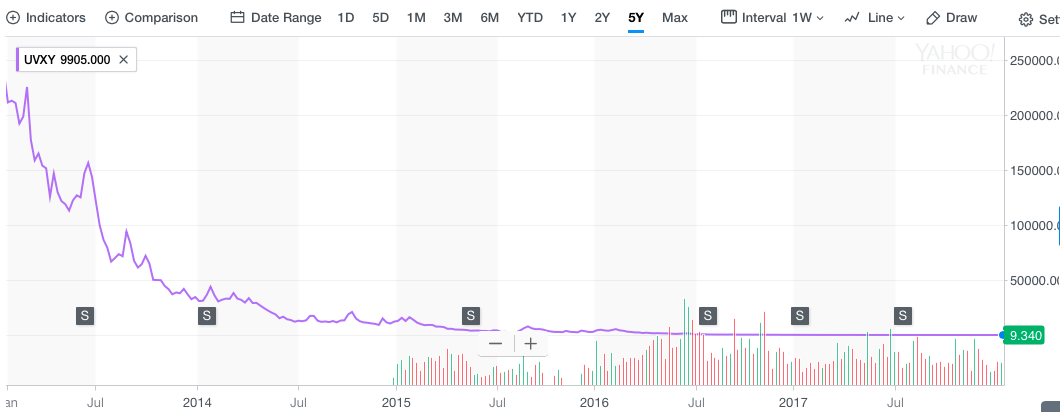 Okay, I get it — that’s not enough to deter the gamblers. After all, the charts for UVXY and VXX leave much room for successful long entries and exits, don’t they? Maybe the several noted reverse splits in the chart below don’t sway longs to consider to the contrary of their notions? Maybe they think they can time one of those blips in the chart below? The last meaningful blip being more than 2 years ago, in August 2015: