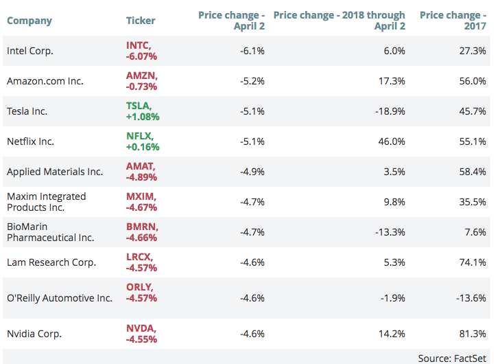 The tech-heavy Nasdaq has maligned the latest re-correction period in equities. The worst performers from Monday’s trade are indicated in the table below from FactSet.