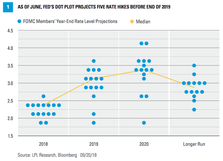 According to respondents to the latest CNBC Fed Survey, a full 98% of the 46 respondents, who include economists, fund managers and strategists, see the Fed hiking rates a quarter point this week to a new range of 2 to 2¼ percent. And 96% believe another quarter-point hike is coming in December. A December rate hike is showing a probability of over 70% presently according to the CME’s FedWatch Tool.