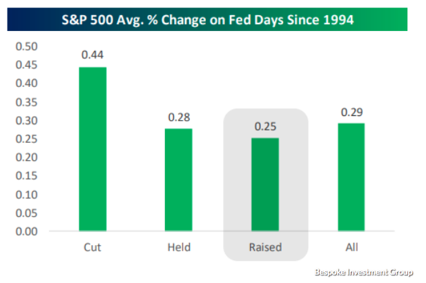 For all years, not just those with rising rates, Vanguard said the annualized average gain is 10 percent. In seven of the 11 periods, rising-rate environments coincided with gains that were smaller than that. While stocks do indeed perform well during rate hike cycles, the day a rate hike is delivered, lately markets tend to react with outsized volatility and decline on the day. Data published by Bespoke Investment Group Tuesday indicate that stocks, on average, fell 0.13% on the last 10 times the central bank held its policy meetings. Longer-term, stocks have done well on Fed Days with the S&P 500 rising an average of 0.28% since 1994 versus the average 0.03% for all trading days.