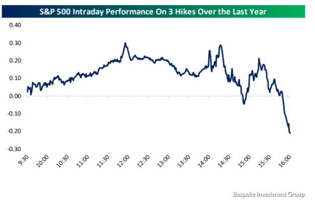 Moreover, the last 3 Fed days have initially found the markets trading well once the Fed announces its rate hike decision, but quickly reversing course thereafter and into the closing bell.