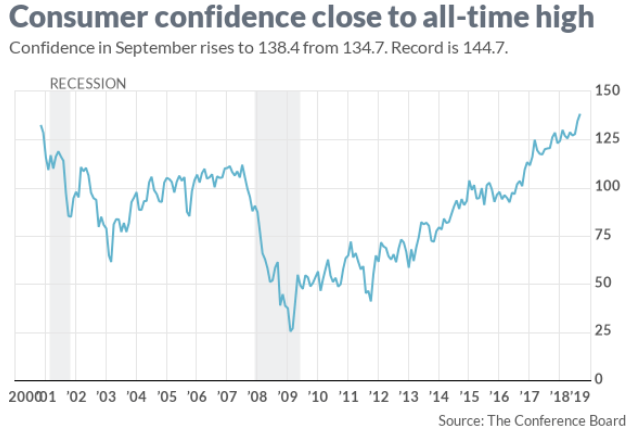 With much of the day aimed squarely on the Fed, yesterday’s Consumer Confidence data may have gone overlooked by investors. The most recent survey, however, shows that Americans are the most confident in the U.S. economy in 18 years and the level of optimism is not far from an all-time high. The consumer confidence index climbed to 138.4 in September from a revised 134.7 in August, the Conference Board said Tuesday. This is the highest level of consumer confidence since 2000.