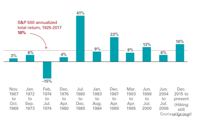 According to Vanguard, periods of rising rates almost always coincide with market gains, even if the move higher in stocks is typically modest. The asset-managing giant looked at data covering the past 50 years, which included 11 periods where the Fed raised rates. The market rose in 10 of the 11 periods, as displayed in the following chart.