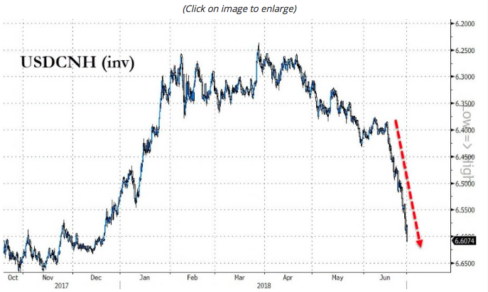 The offshoot of China’s equity market declines is the rapid decline in the Yuan. It’s decent is starting to wreak havoc on global markets. The chart below shows just how fast the Yuan has spiraled lower.