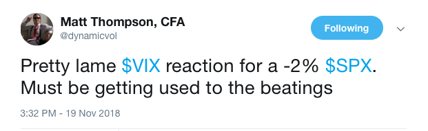 As the market declines have persisted since October and after a brief relief rally, some market participants are a little confounded as to why the VIX has remained elevated, but not expressing the extremes the equity market is expressing in price level value. Let’s face it, an almost 2% move lower on the S&P 500 yesterday and the VIX only jumped 12% on the day. Another question investors are pondering along the same lines is that the VIX has not reached the peaks it reached at the October SPX lows, even though the SPX has essentially revisited the same low levels.