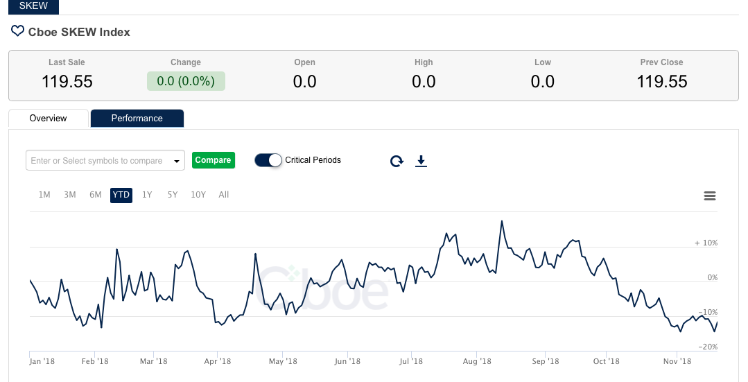 Pretty cool huh? That’s right; the SKEW Index is presently reading 119.55 right near the long-term average closing. This basically indicates only modest tail risk, but nothing out of the ordinary. It’s even significantly lower than the September period. Speaking of September, the period leading up to the October-present correction for the SPX, let’s minimize the duration of the SKEW Index chart to see what SKEW was telling us back in September.