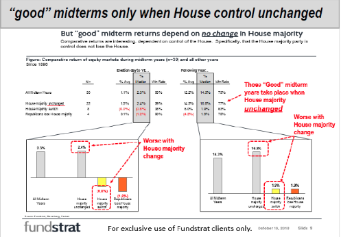 The data compiled by Fundstrat Global Advisors showed that post-midterm rallies hinge on the majority party maintaining control of the House. That’s not what happened this time around as the House flipped to the Democrat side. Fundstrat Global Advisors showed the median stock market return since 1896 was only 1.9% a year after the House majority flipped from one party to the other. Meanwhile, the median return totaled 16.8% when the House majority stayed the same after the midterms.