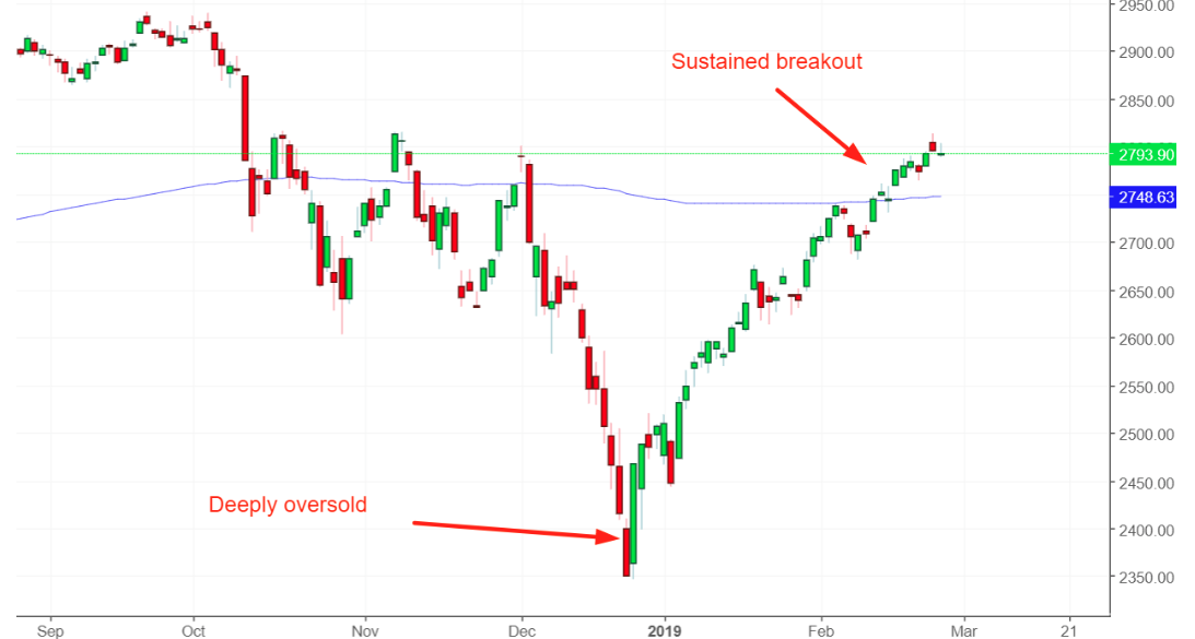 The S&P 500’s breakout has been impressive and found with strong breadth and momentum. Most importantly, he S&P 500’s breakout above its 200-DMA has been sustained. The S&P has not gone back-and-forth around its 200-DMA, even with earnings expected to decline in the Q1 2019 period and bond yields falling.