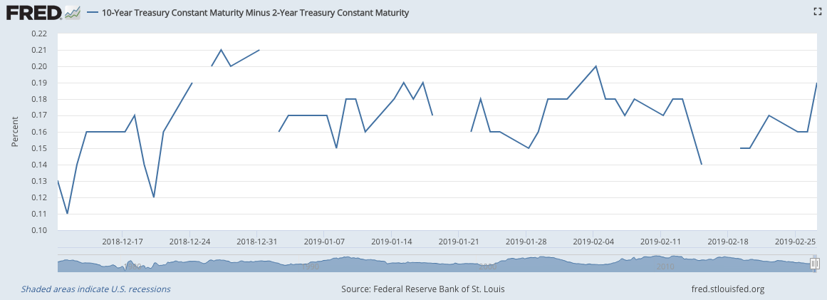 Speaking of inflation, well not really but in terms of the bond market and rising yields Friday also proved eventful. Friday found the spread between the 2-yr. Treasury yield and the 10-yr. Treasury yield above 20 bps for the first time in 2019 as depicted in the chart below.